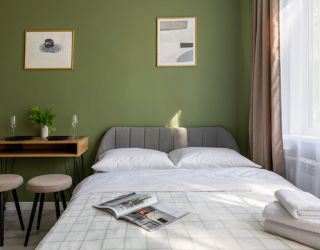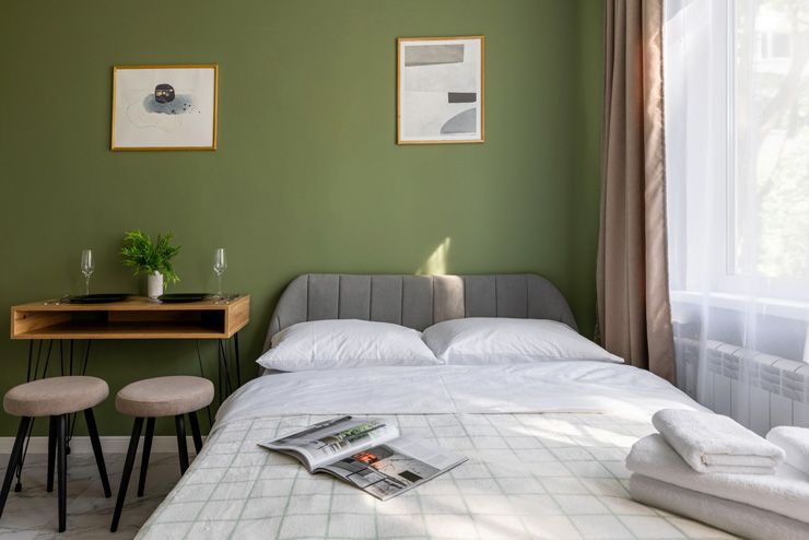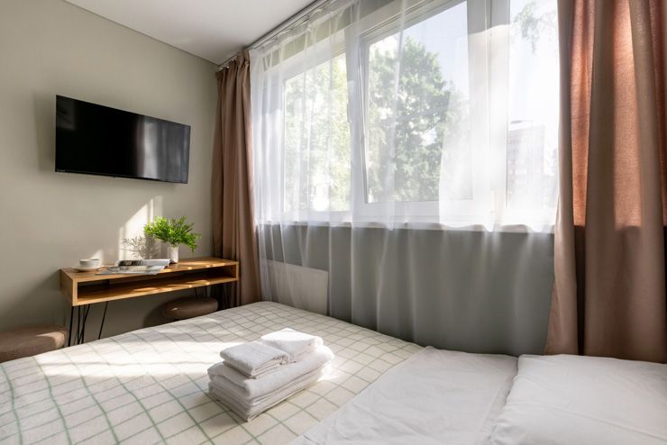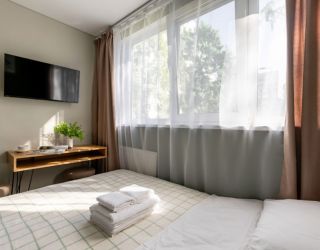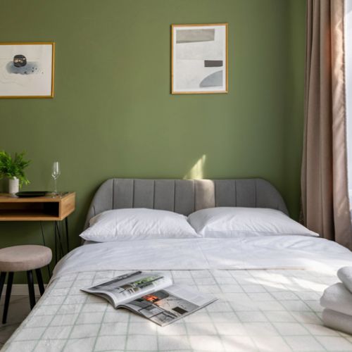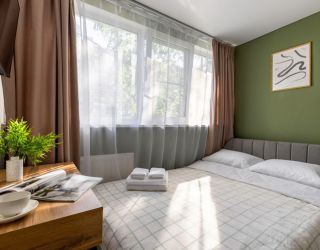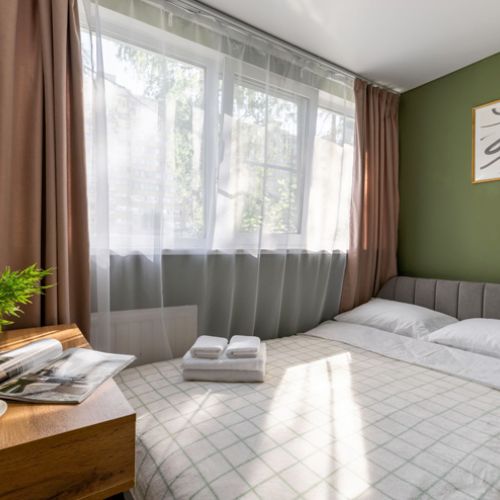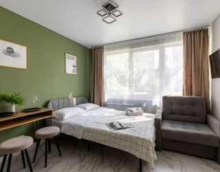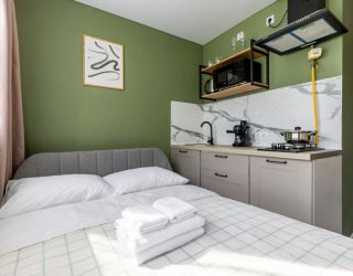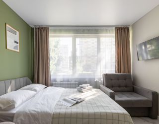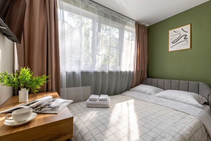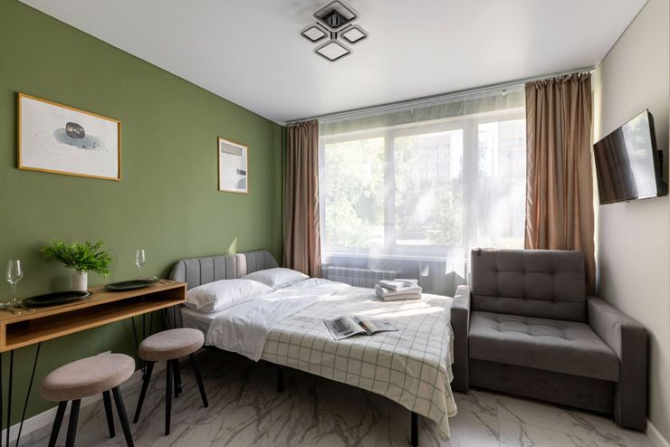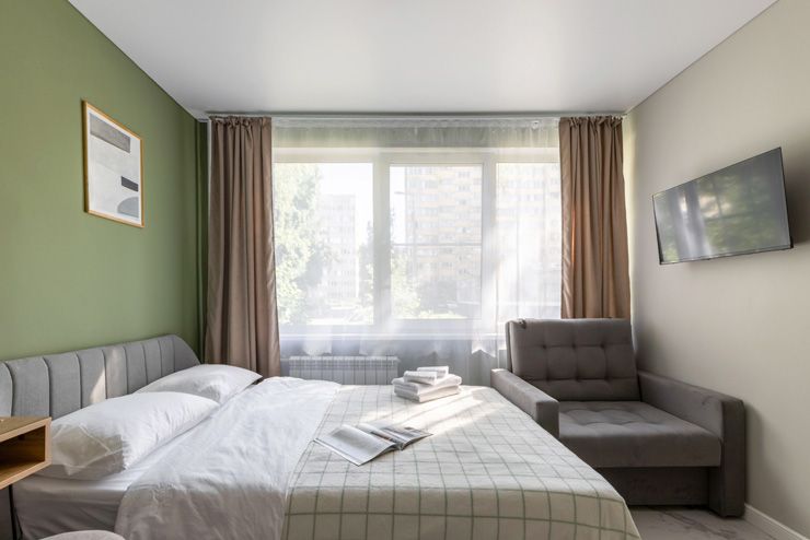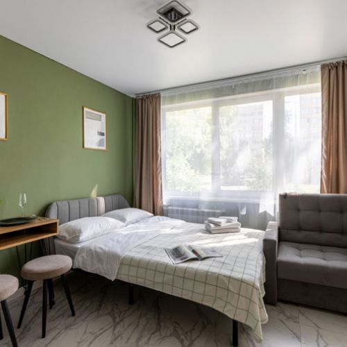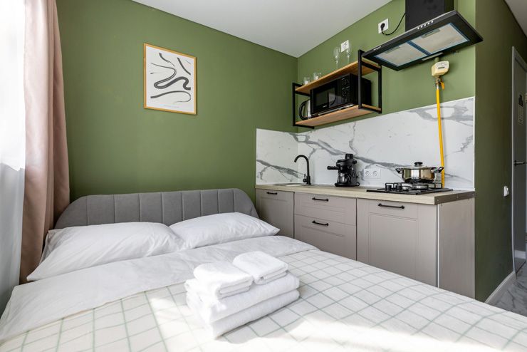 Для размещения предлагается квартира-студия с удобной двуспальной кроватью и ортопедическим матрасом. В апартаментах есть все для комфортного отдыха –– отдельная ванная, оборудованная кухня, телевизор со SMART-TV, Wi Fi, стиральная машина.