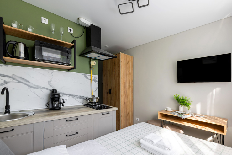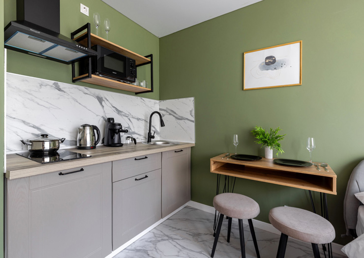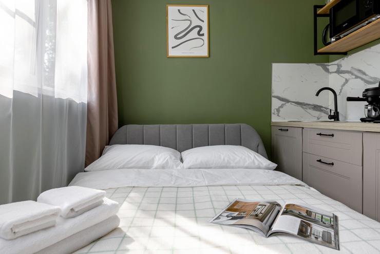 Поездом до ж/д вокзала Московский (г. Санкт-Петербург), далее на метро до станции «Проспект Просвещения», далее на рейсовом автобусе №121 до остановки «ул. Симонова», далее пройти пешком 260 м до апартаментов.